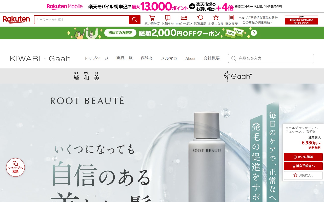 This page showcases a scalp massage hair essence product sold on Rakuten Market, priced from 6,980 yen. Recomm...