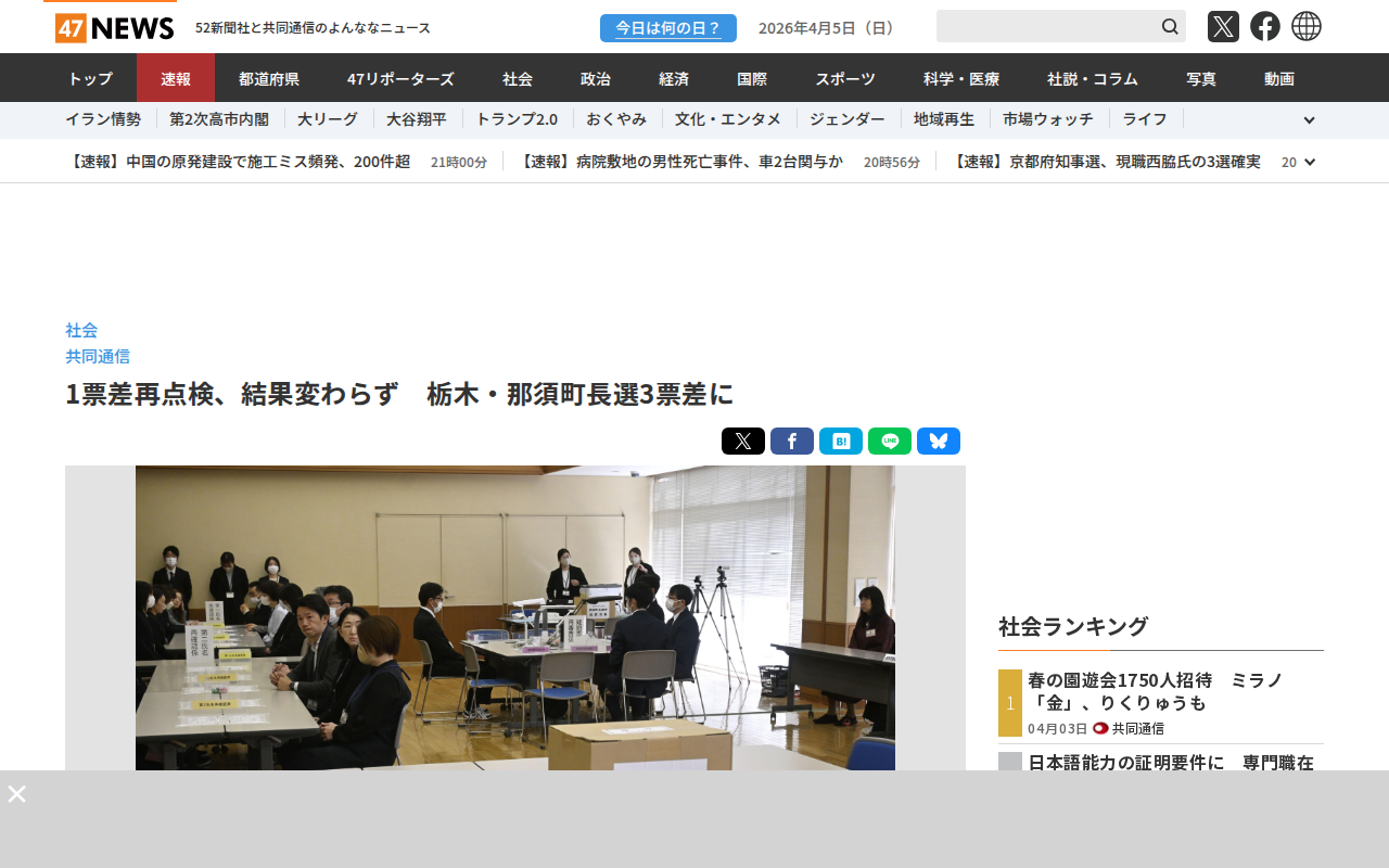 1票差再点検、結果変わらず 栃木・那須町長選3票差に|47NEWS(よんななニュース)