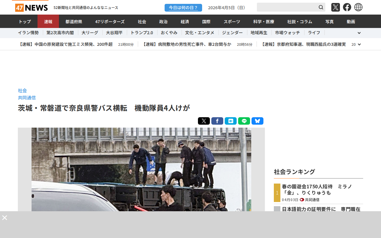 茨城・常磐道で奈良県警バス横転 機動隊員4人けが|47NEWS(よんななニュース)