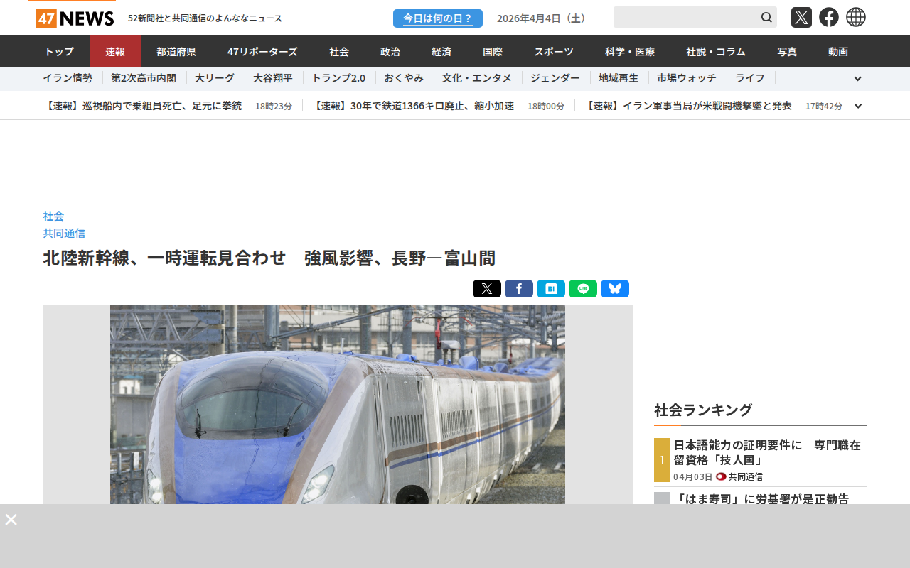 北陸新幹線、一時運転見合わせ 強風影響、長野―富山間|47NEWS(よんななニュース)