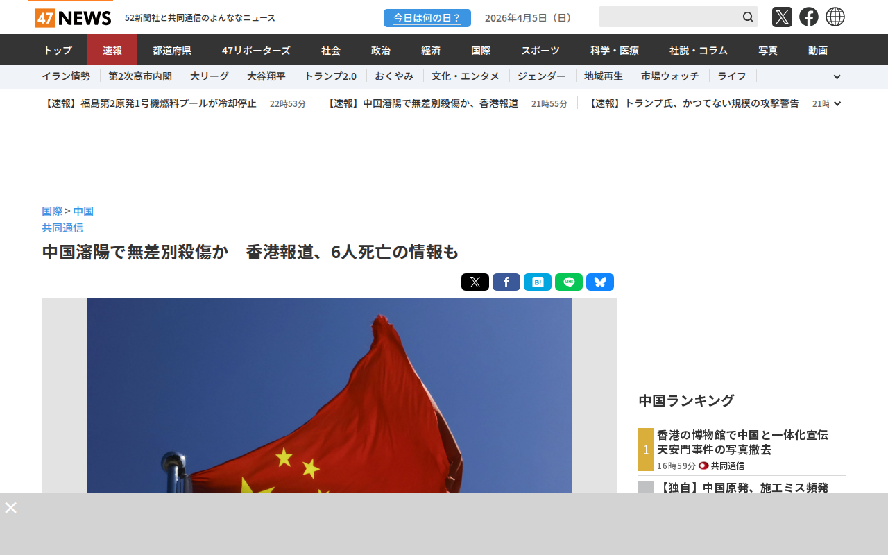 中国瀋陽で無差別殺傷か 香港報道、6人死亡の情報も|47NEWS(よんななニュース)