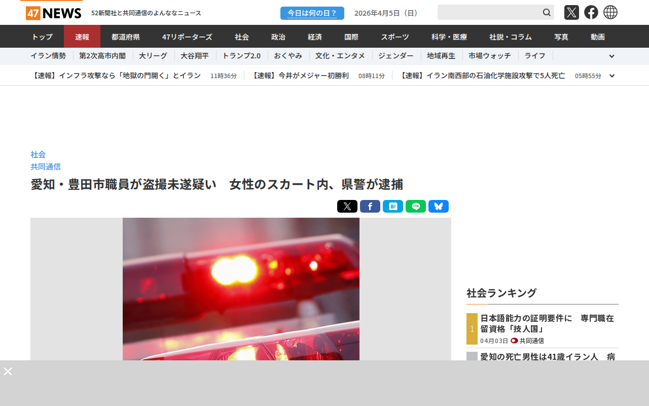 This page reports on the arrest of a 47-year-old municipal employee from Toyota City, Aichi Prefecture, who wa...