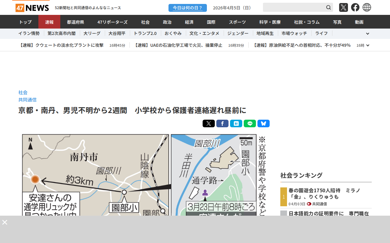 京都・南丹、男児不明から2週間 小学校から保護者連絡遅れ昼前に|47NEWS(よんななニュース)