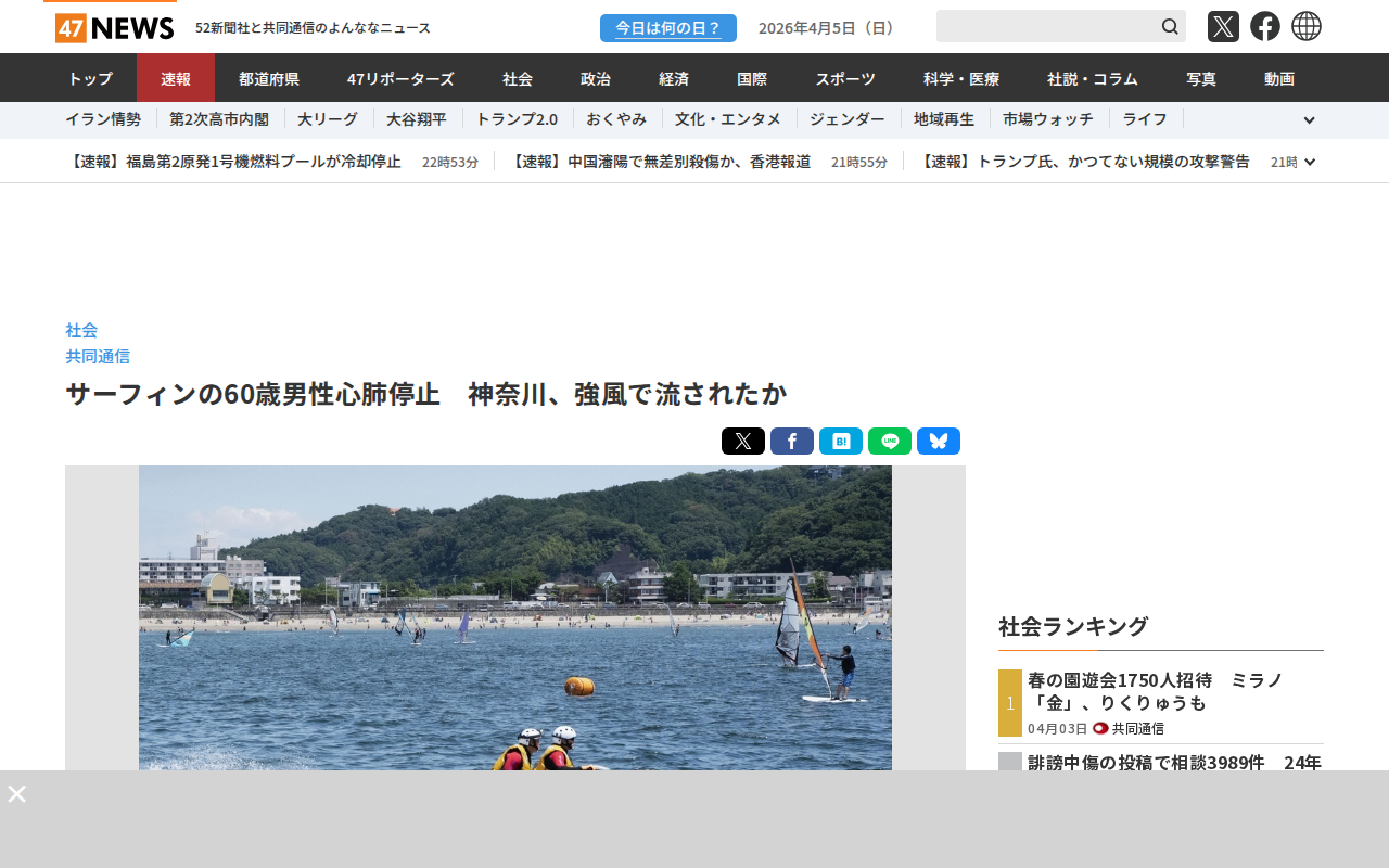 サーフィンの60歳男性心肺停止 神奈川、強風で流されたか|47NEWS(よんななニュース)