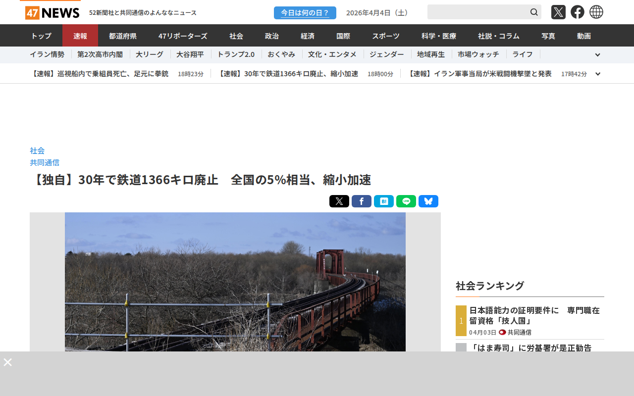 【速報】30年で鉄道1366キロ廃止、縮小加速|47NEWS(よんななニュース)