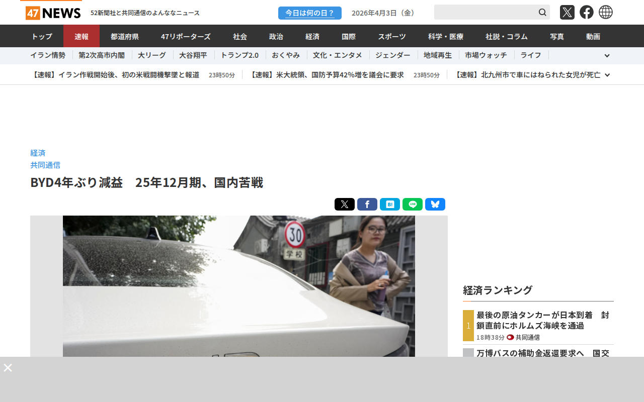BYD4年ぶり減益 25年12月期、国内苦戦|47NEWS(よんななニュース)
