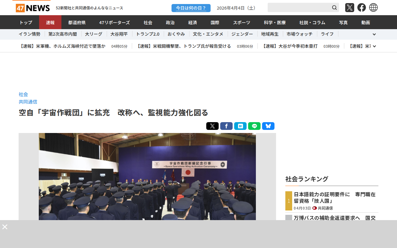 空自「宇宙作戦団」に拡充 改称へ、監視能力強化図る|47NEWS(よんななニュース)