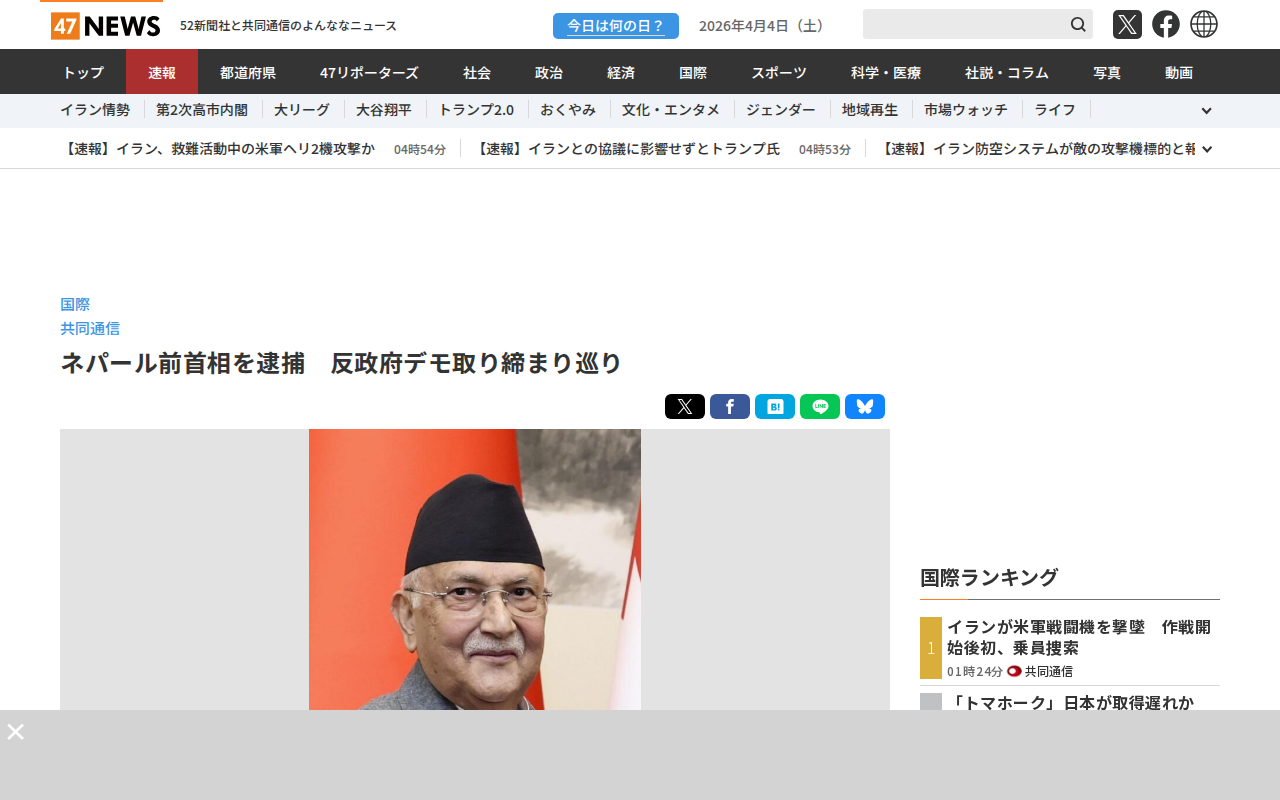 ネパール前首相を逮捕 反政府デモ取り締まり巡り|47NEWS(よんななニュース)