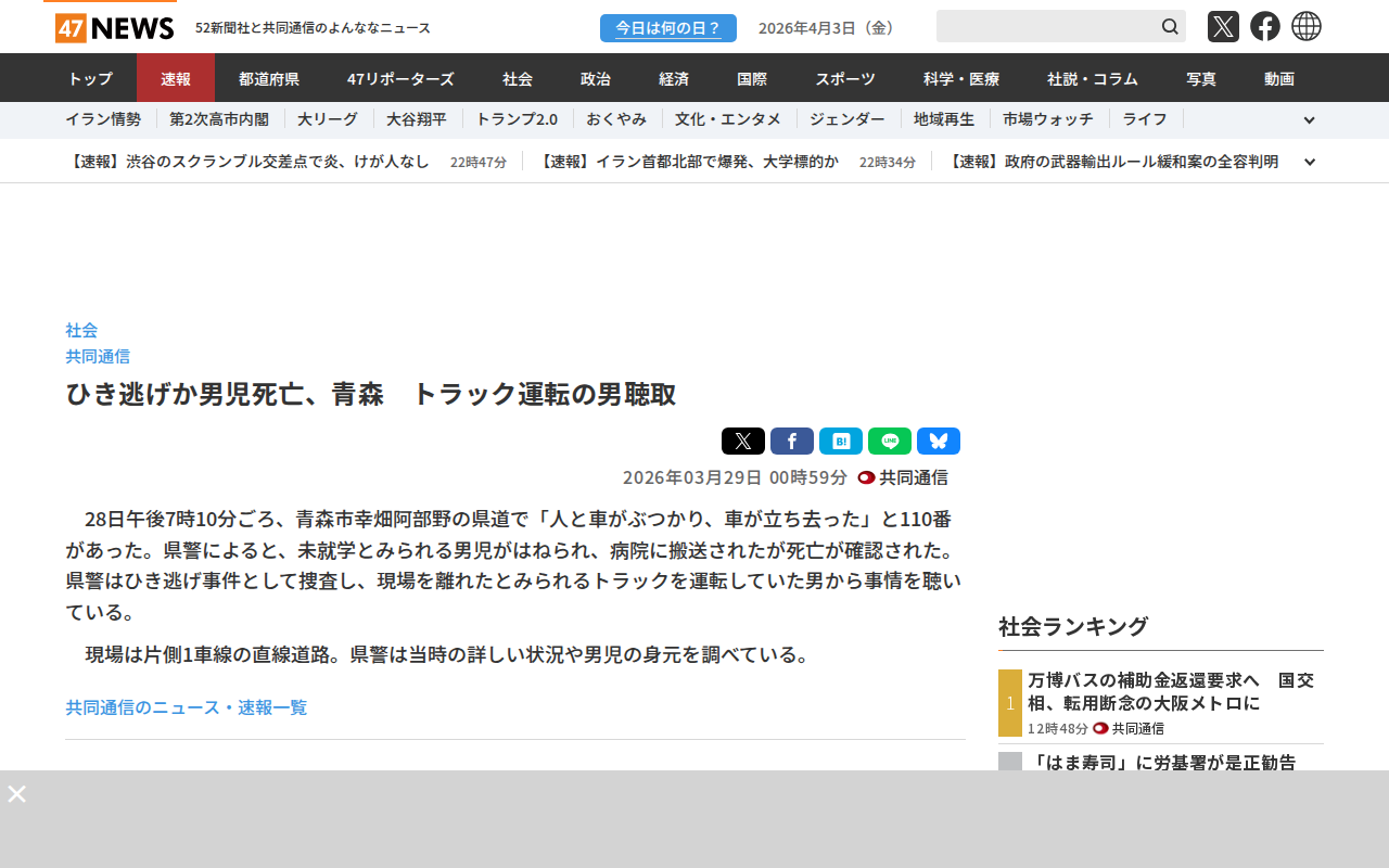 ひき逃げか男児死亡、青森 トラック運転の男聴取|47NEWS(よんななニュース)