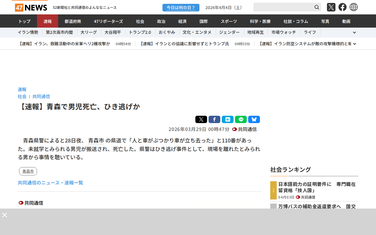 【速報】青森で男児死亡、ひき逃げか|47NEWS(よんななニュース)