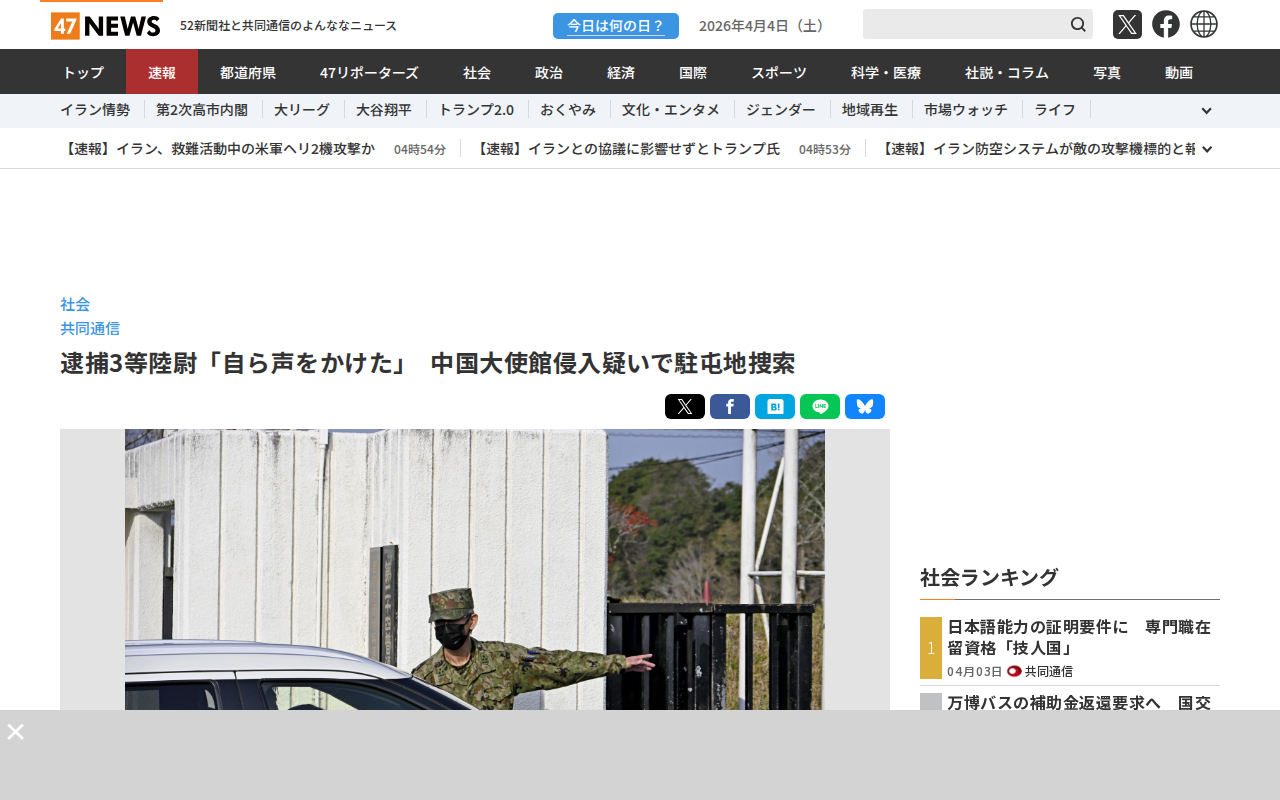 逮捕3等陸尉「自ら声をかけた」 中国大使館侵入疑いで駐屯地捜索|47NEWS(よんななニュース)