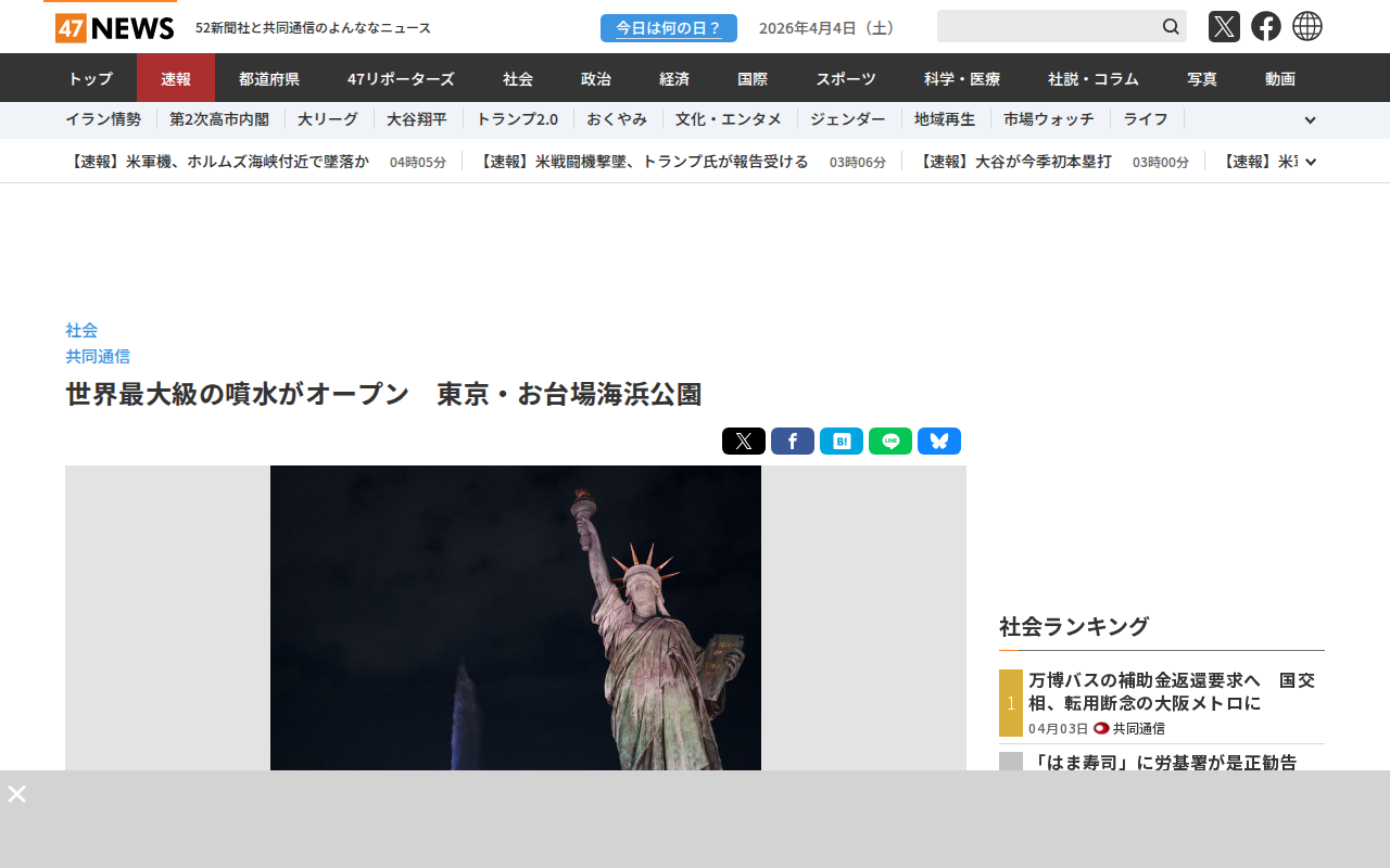 世界最大級の噴水がオープン 東京・お台場海浜公園|47NEWS(よんななニュース)