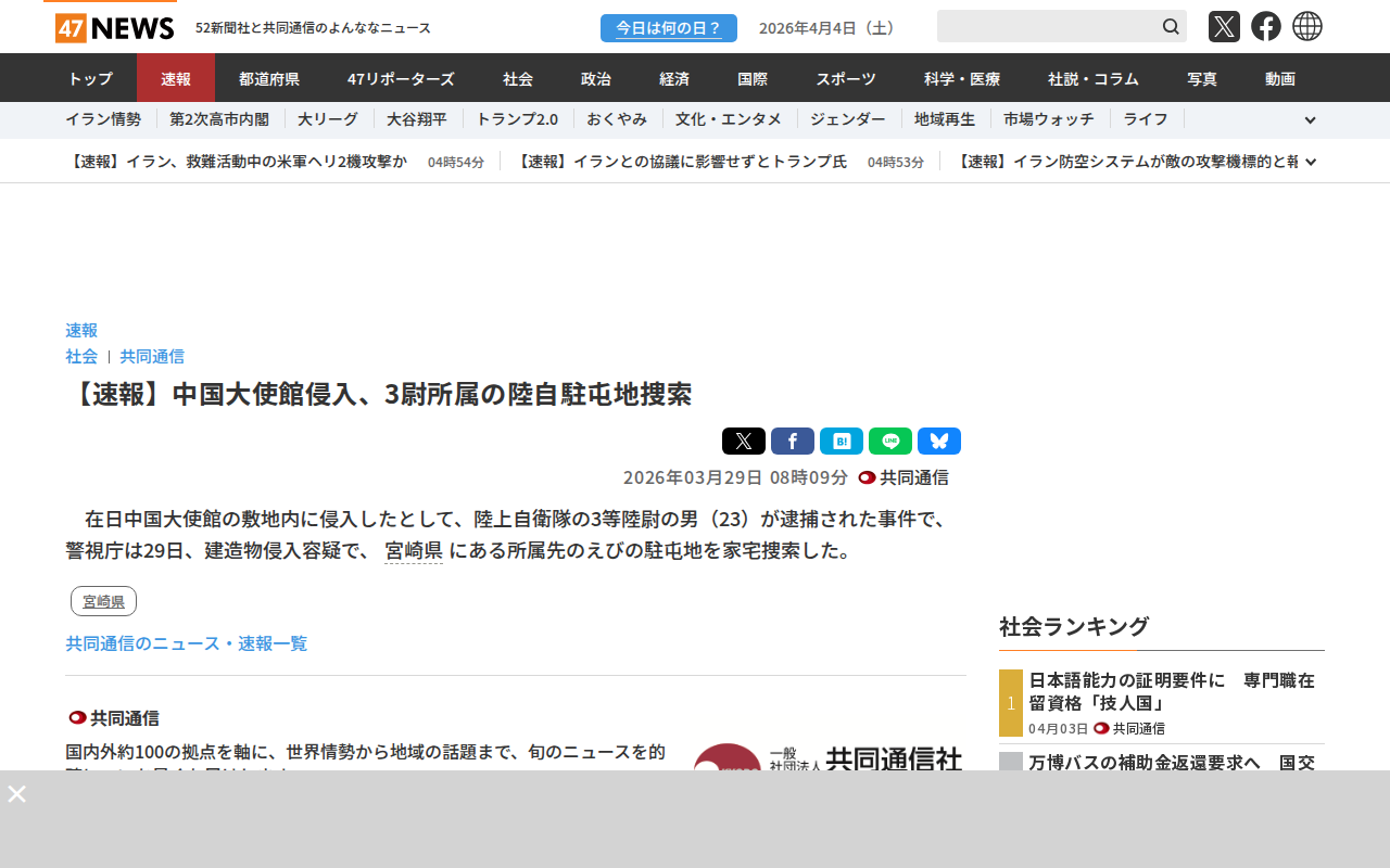 【速報】中国大使館侵入、3尉所属の陸自駐屯地捜索|47NEWS(よんななニュース)