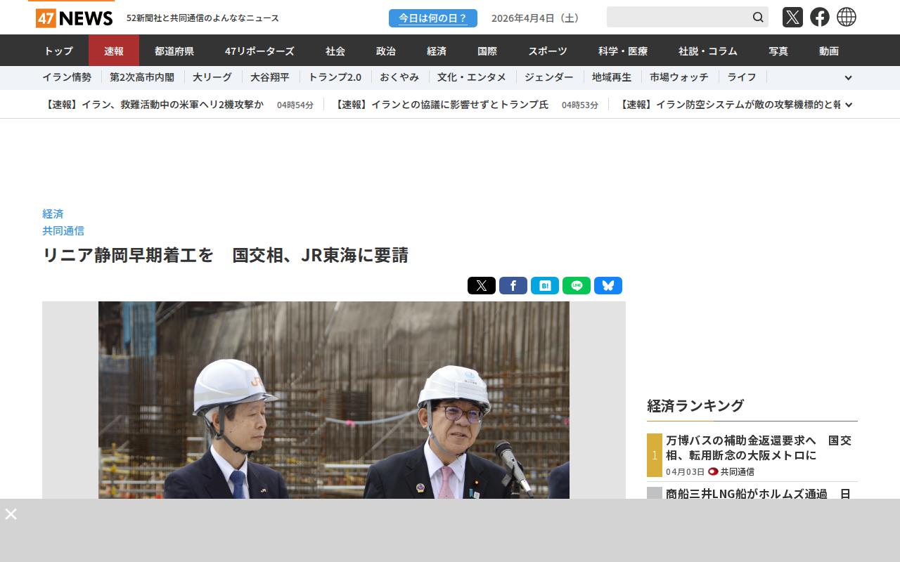リニア静岡早期着工を 国交相、JR東海に要請|47NEWS(よんななニュース)