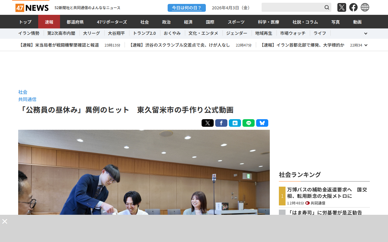 「公務員の昼休み」異例のヒット 東久留米市の手作り公式動画|47NEWS(よんななニュース)