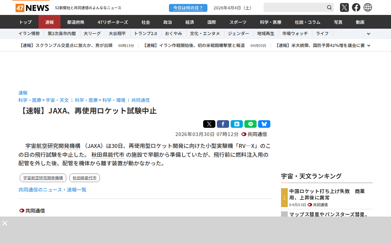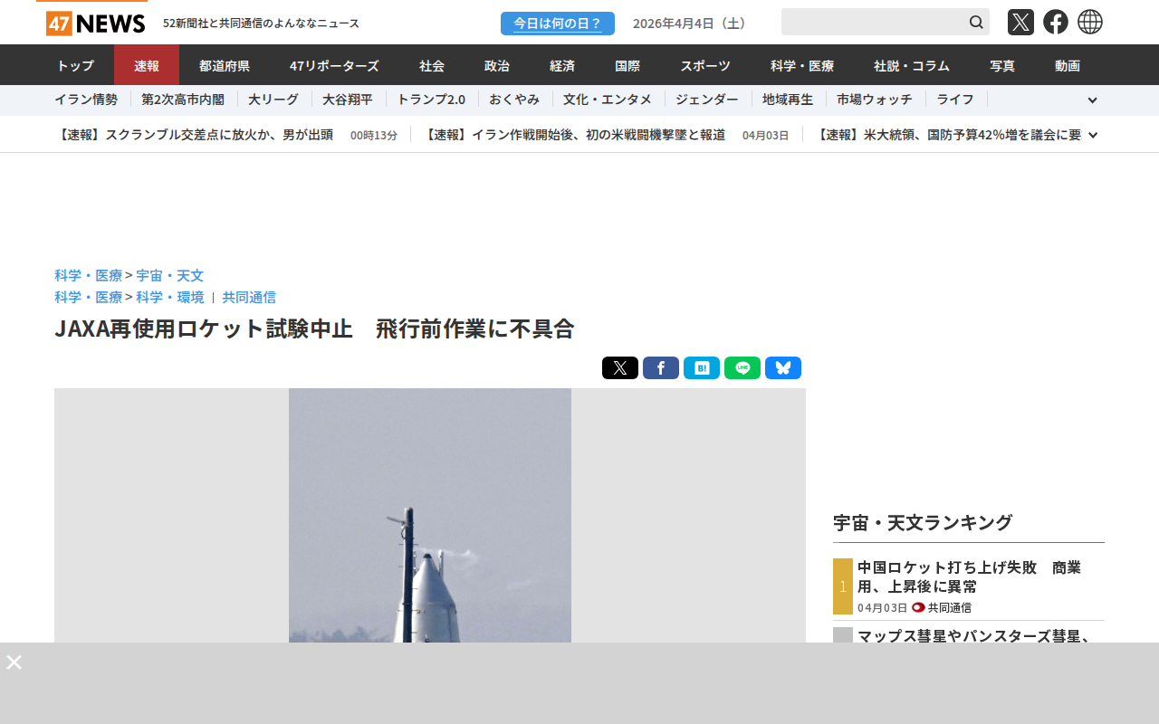 【速報】JAXA、再使用ロケット試験中止|47NEWS(よんななニュース)