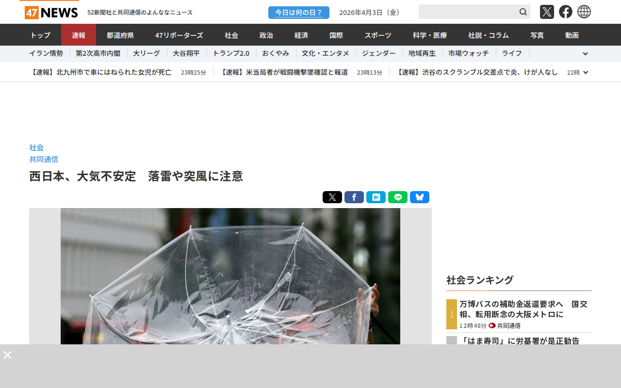 西日本、大気不安定 落雷や突風に注意|47NEWS(よんななニュース)