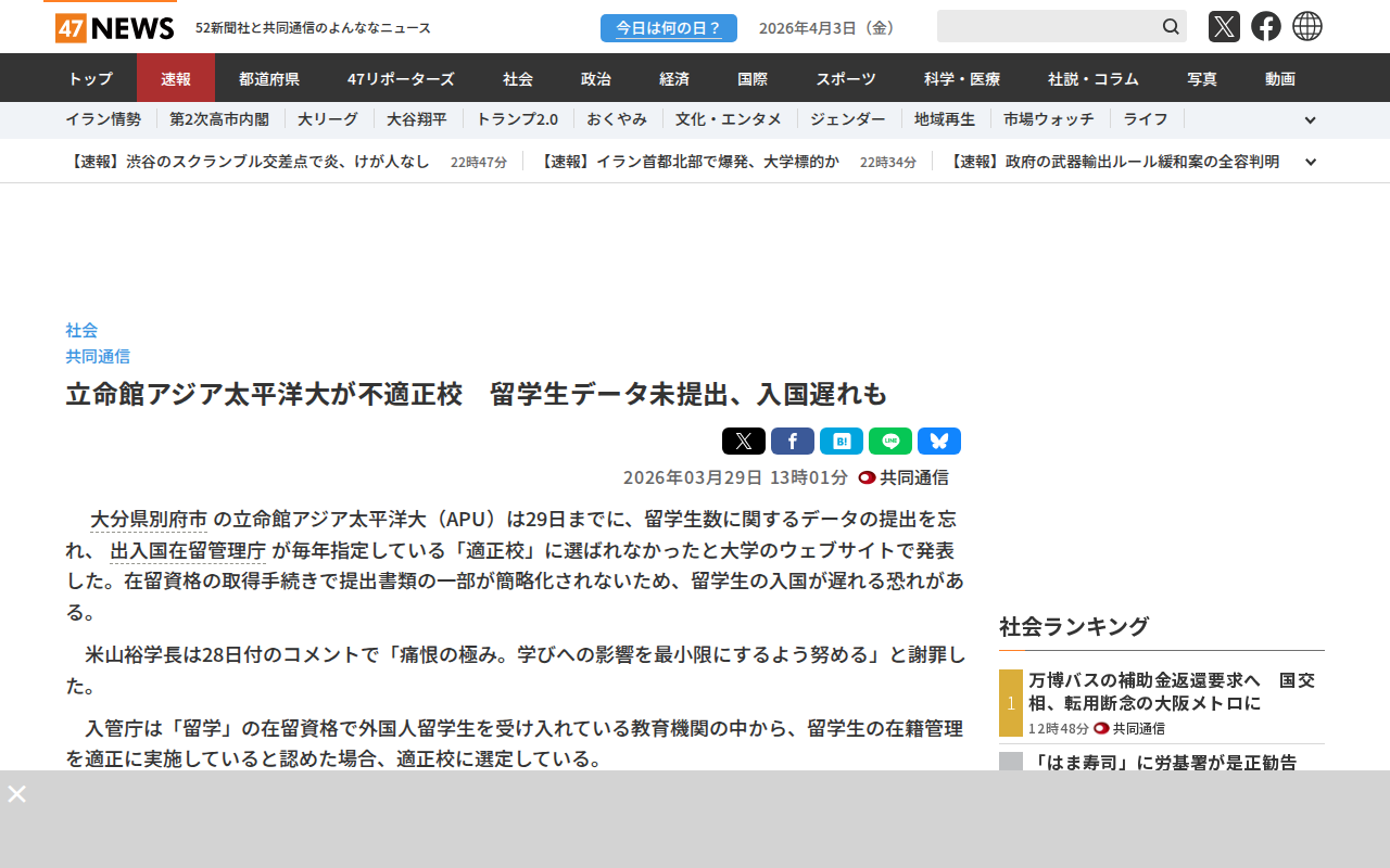 立命館アジア太平洋大が不適正校 留学生データ未提出、入国遅れも|47NEWS(よんななニュース)