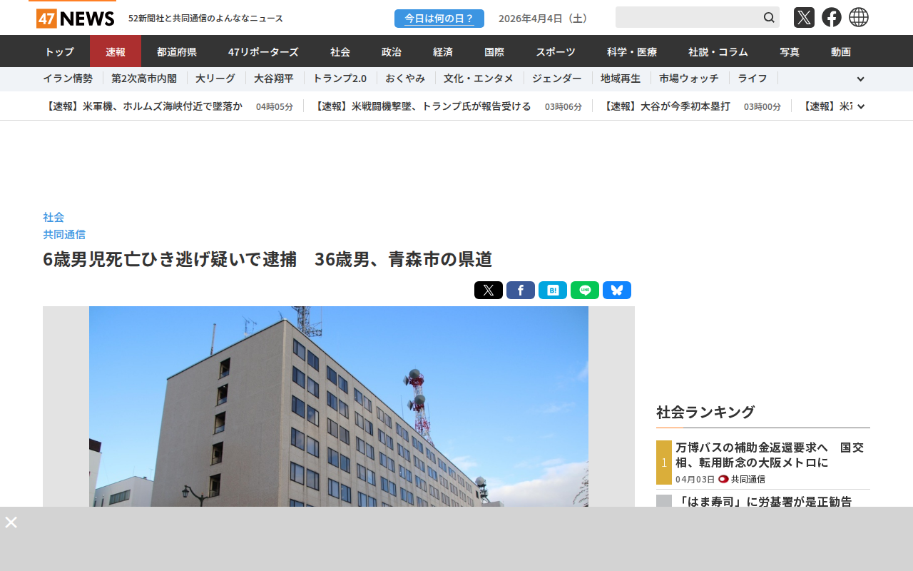 6歳男児死亡ひき逃げ疑いで逮捕 36歳男、青森市の県道|47NEWS(よんななニュース)