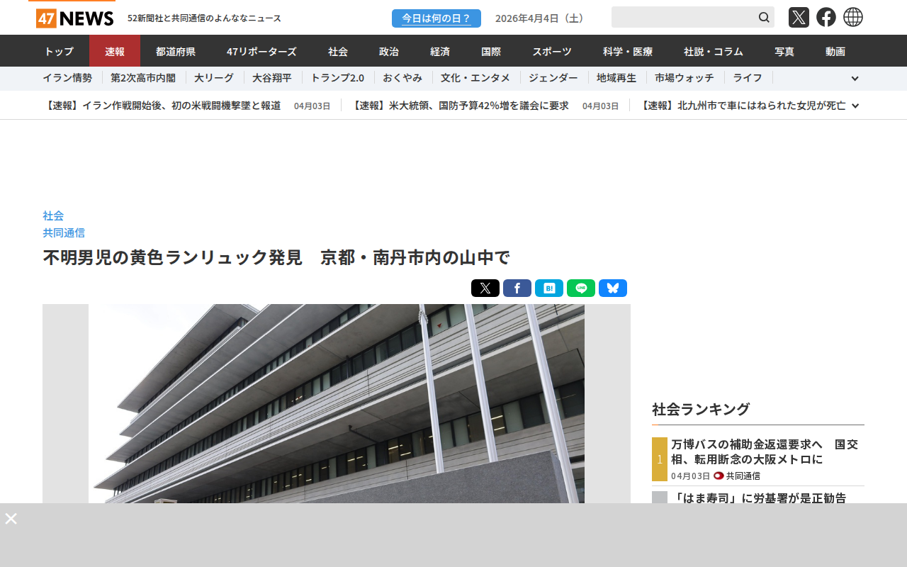 不明男児の黄色ランリュック発見 京都・南丹市内の山中で|47NEWS(よんななニュース)