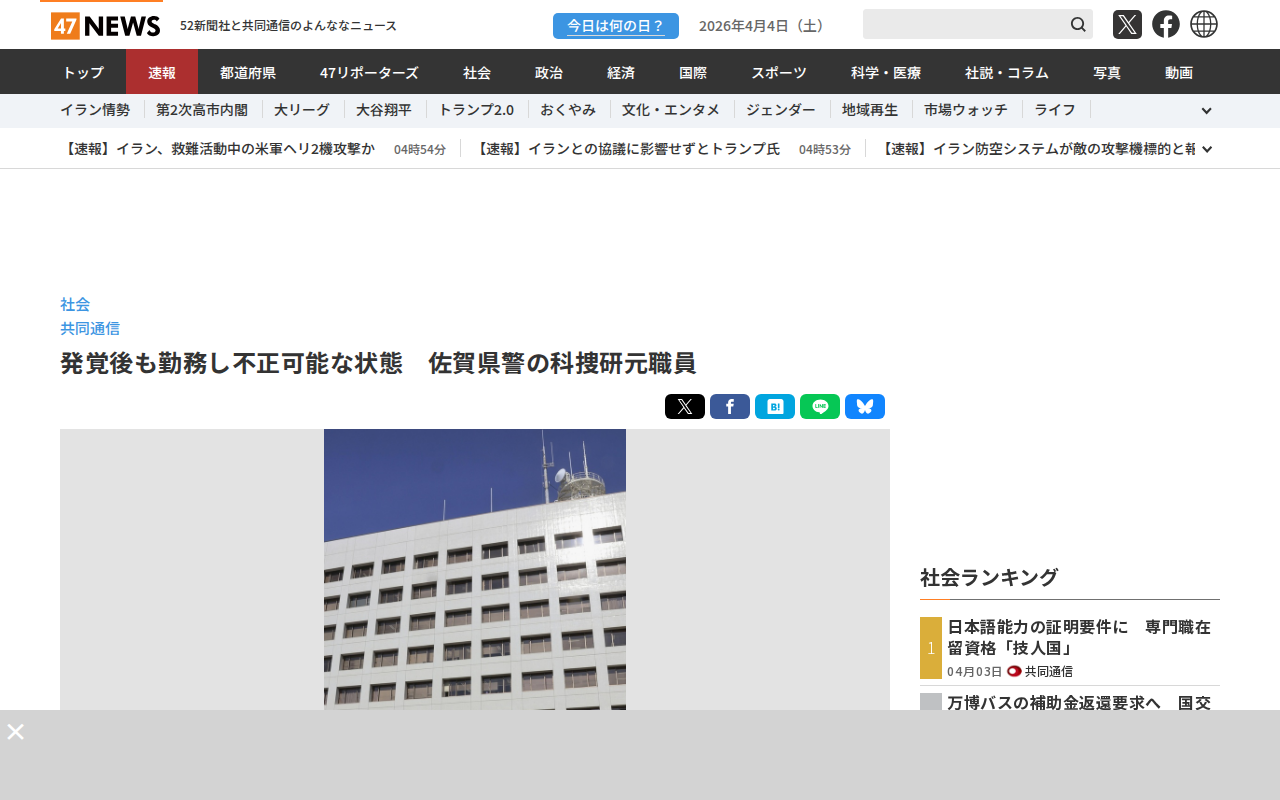 発覚後も勤務し不正可能な状態 佐賀県警の科捜研元職員|47NEWS(よんななニュース)
