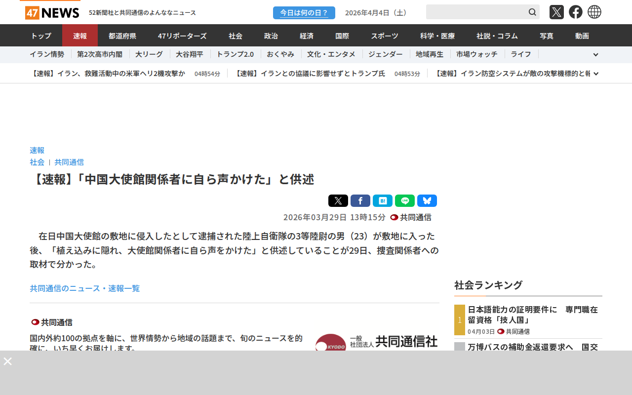 【速報】「中国大使館関係者に自ら声かけた」と供述|47NEWS(よんななニュース)