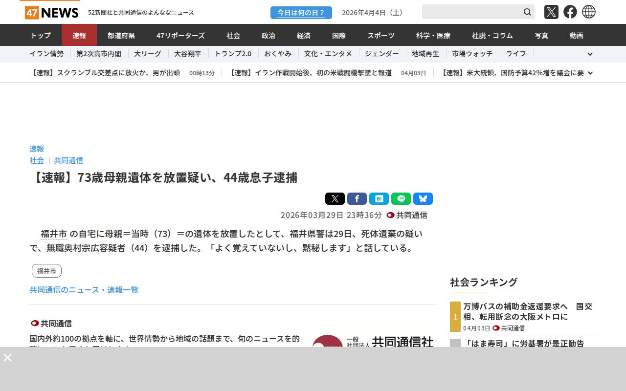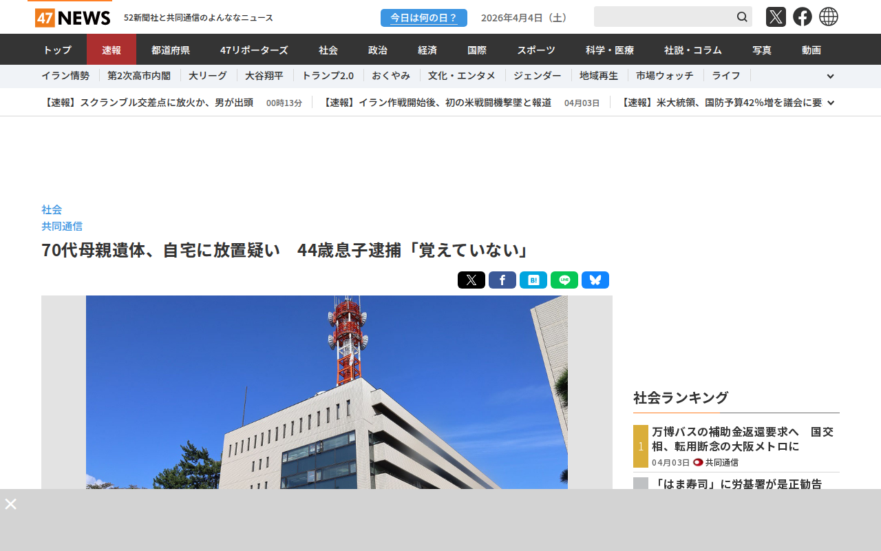 【速報】73歳母親遺体を放置疑い、44歳息子逮捕|47NEWS(よんななニュース)