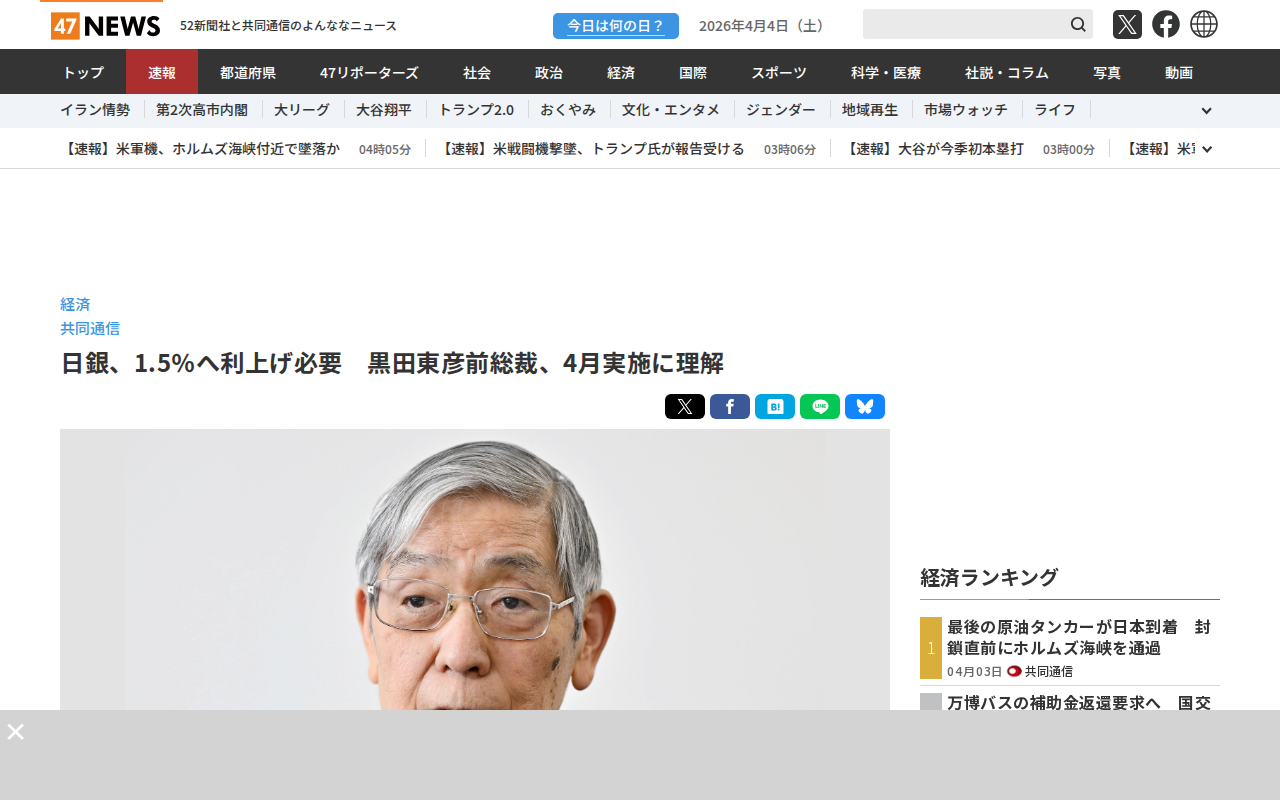 日銀、1.5%へ利上げ必要 黒田東彦前総裁、4月実施に理解|47NEWS(よんななニュース)