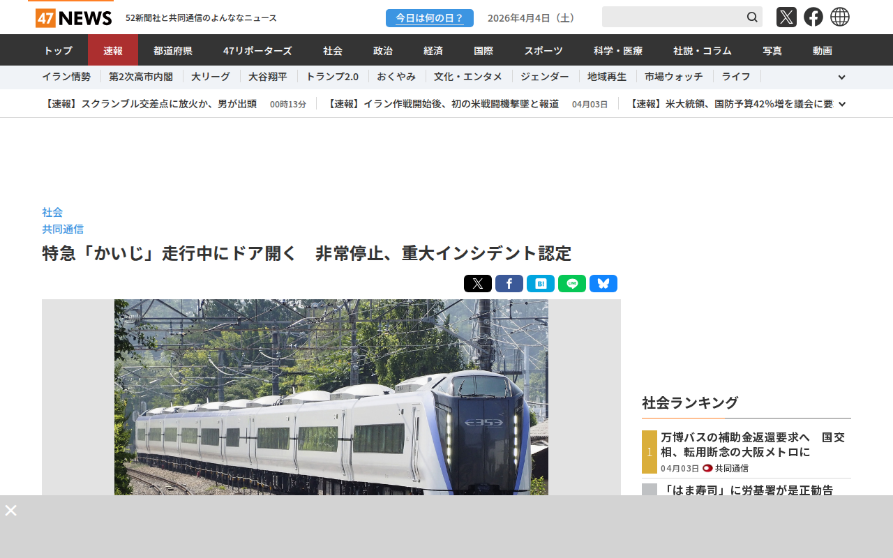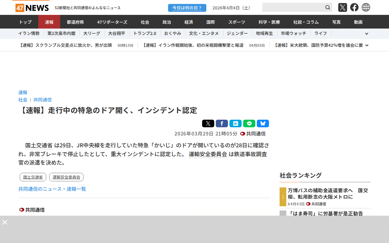 【速報】走行中の特急のドア開く、インシデント認定|47NEWS(よんななニュース)