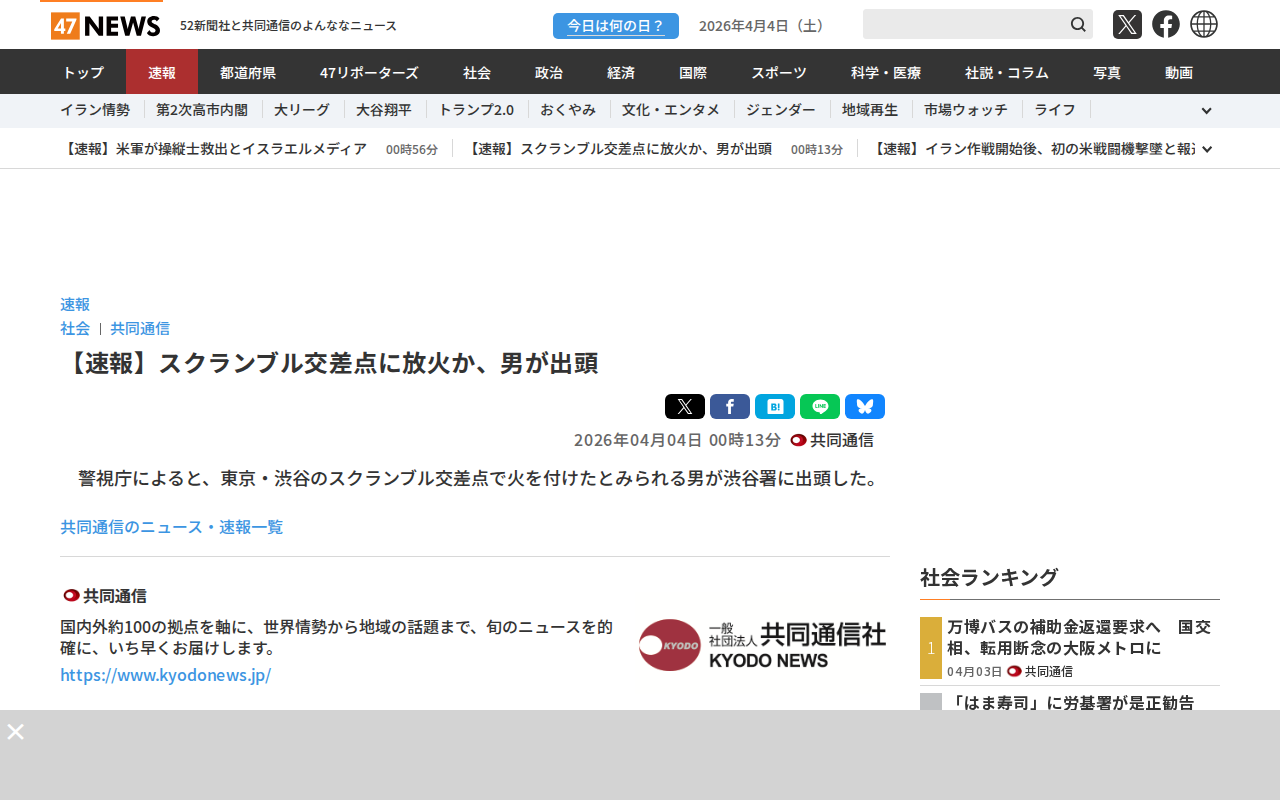 【速報】スクランブル交差点に放火か、男が出頭|47NEWS(よんななニュース)