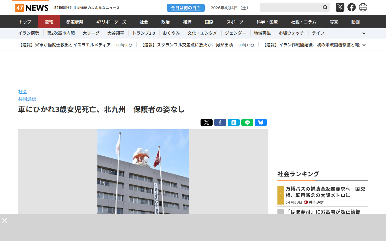 車にひかれ3歳女児死亡、北九州 保護者の姿なし|47NEWS(よんななニュース)