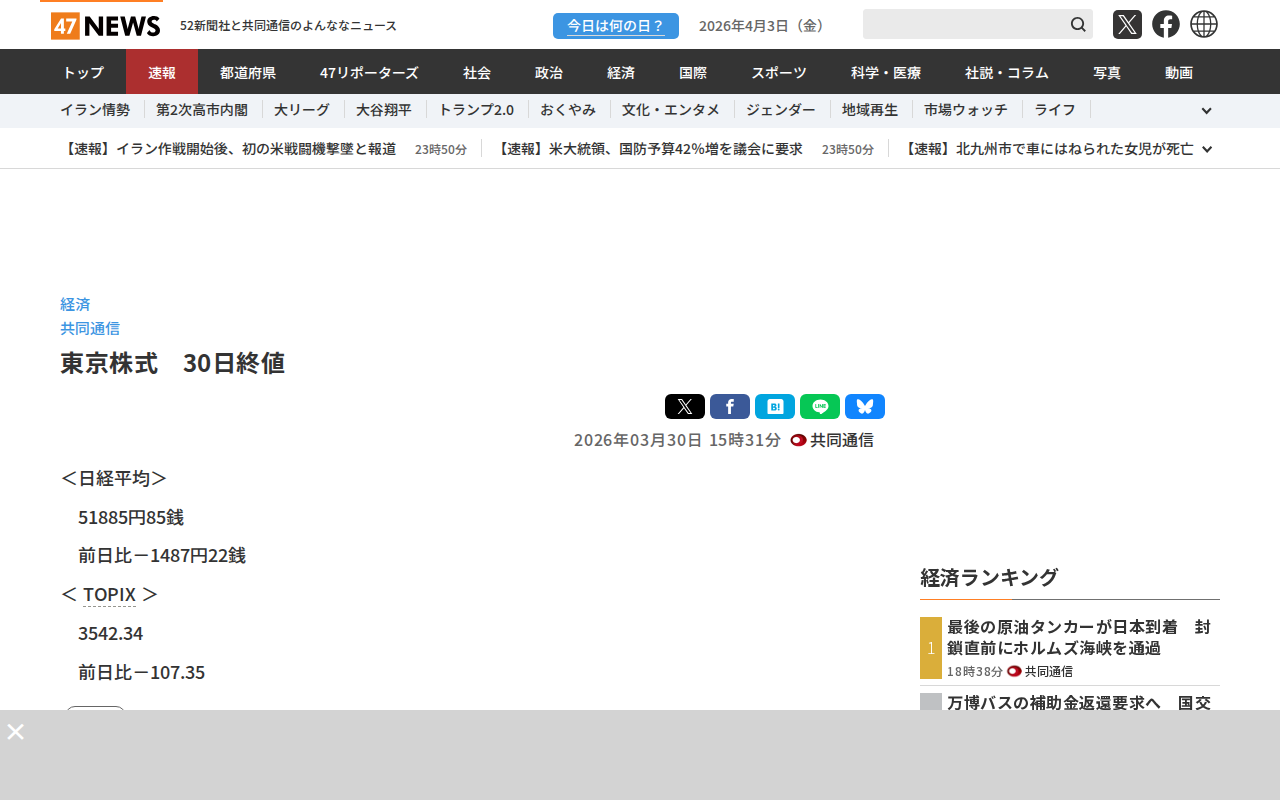 東京株式 30日終値 |47NEWS(よんななニュース)