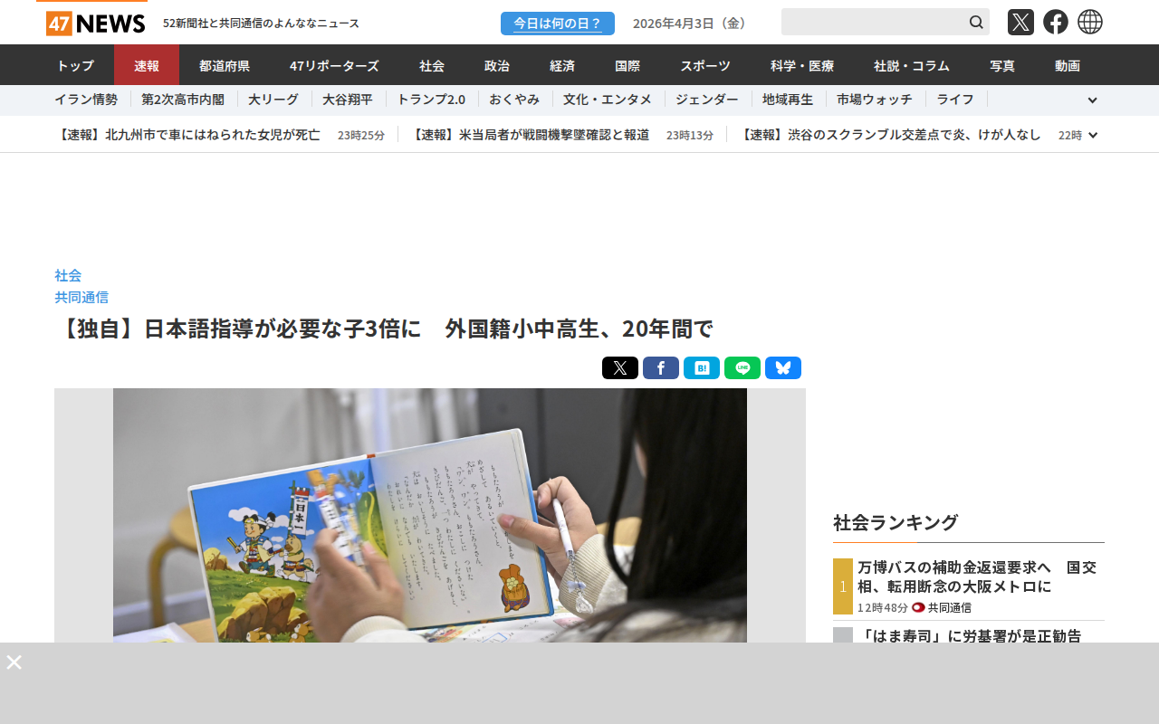 【独自】日本語指導が必要な子3倍に 外国籍小中高生、20年間で|47NEWS(よんななニュース)