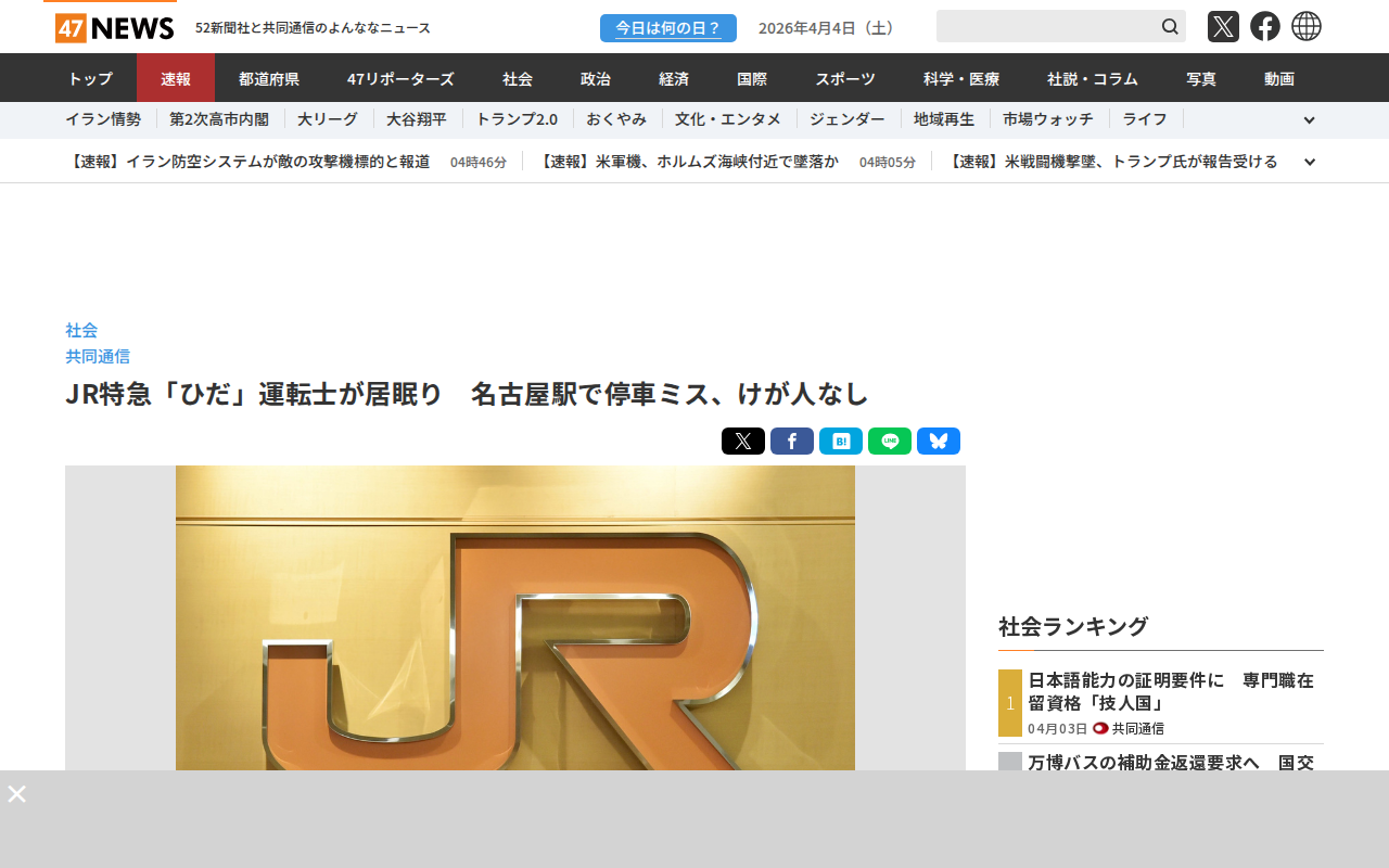 JR特急「ひだ」運転士が居眠り 名古屋駅で停車ミス、けが人なし|47NEWS(よんななニュース)
