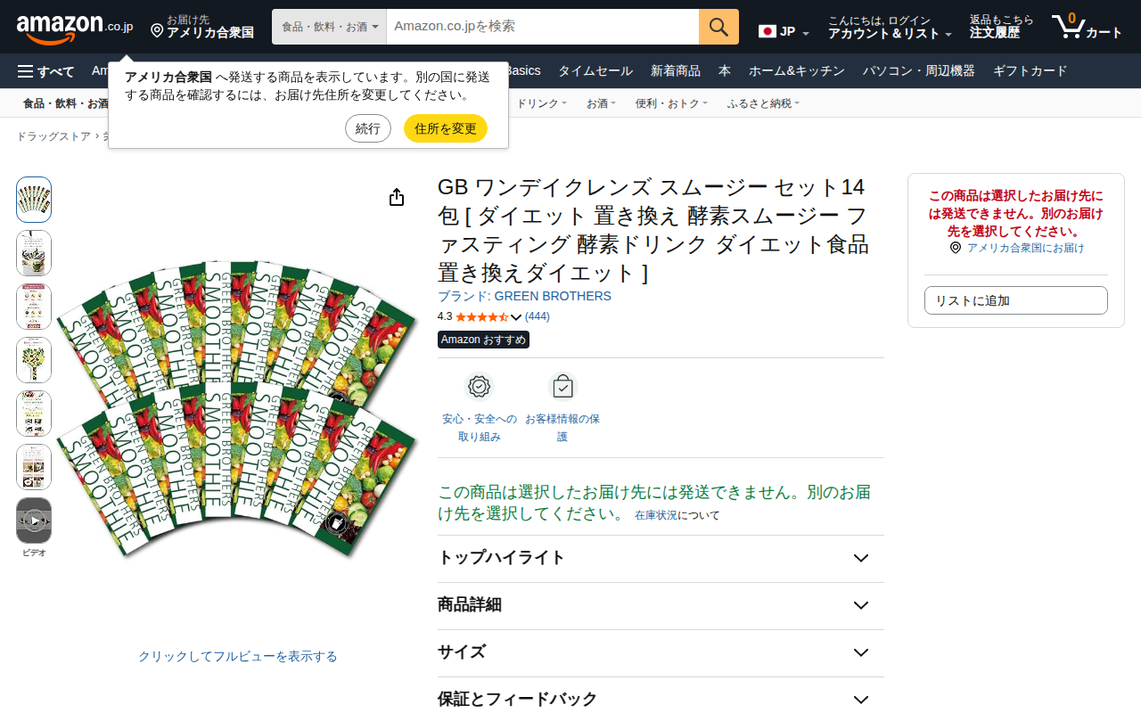 This page is an Amazon product listing for GB One Day Cleanse Smoothie 14 packets by GREEN BROTHERS, a diet pr...