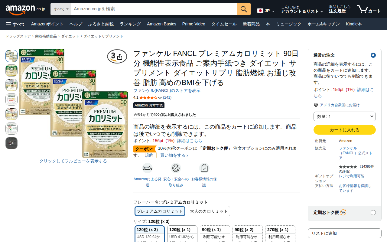 This page introduces FANCL's Premium Calorie Limit supplement for 90 days (30 days×3 bags). It's a functional ...