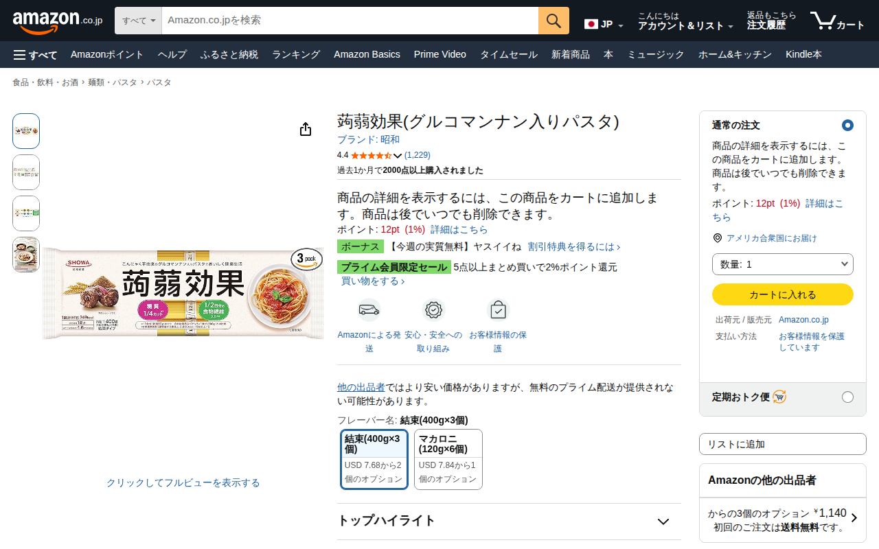 This page is an Amazon.co.jp product listing for "Konnyaku Effect," a pasta containing glucomannan by the Show...