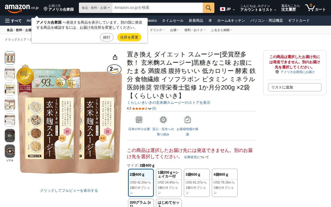 This page is an Amazon product listing for a replacement diet smoothie made with koji and brown rice, flavored...