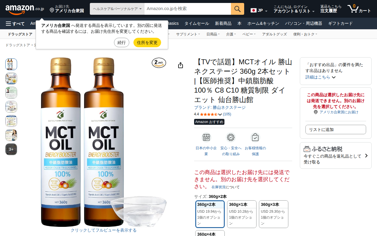 This page features the Katsuyama Nextage MCT Oil 360g 2-bottle set on Amazon.co.jp. It's a popular product wit...