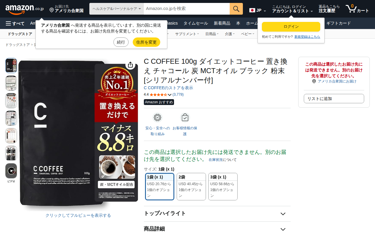 This page features C COFFEE 100g, a diet coffee product sold on Amazon. It's a powder-type replacement coffee ...
