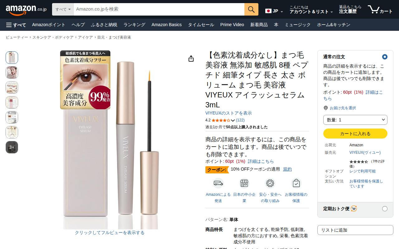 This page presents VIYEUX's eyelash serum "Eye Lash Serum," designed for sensitive skin without pigmentation c...