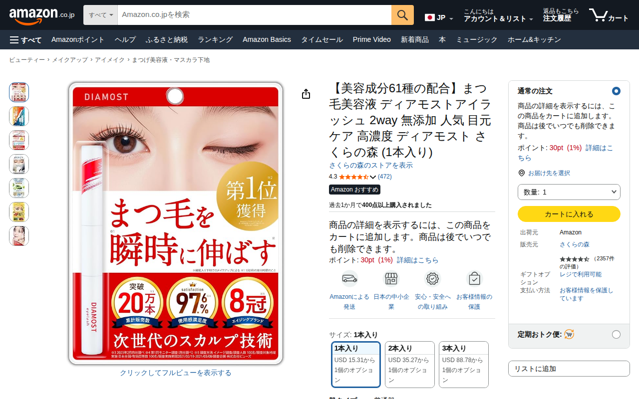 This page presents the "Diamost Eye Lash 2Way" lash serum by Sakura no Mori. It features 61 beauty ingredients...