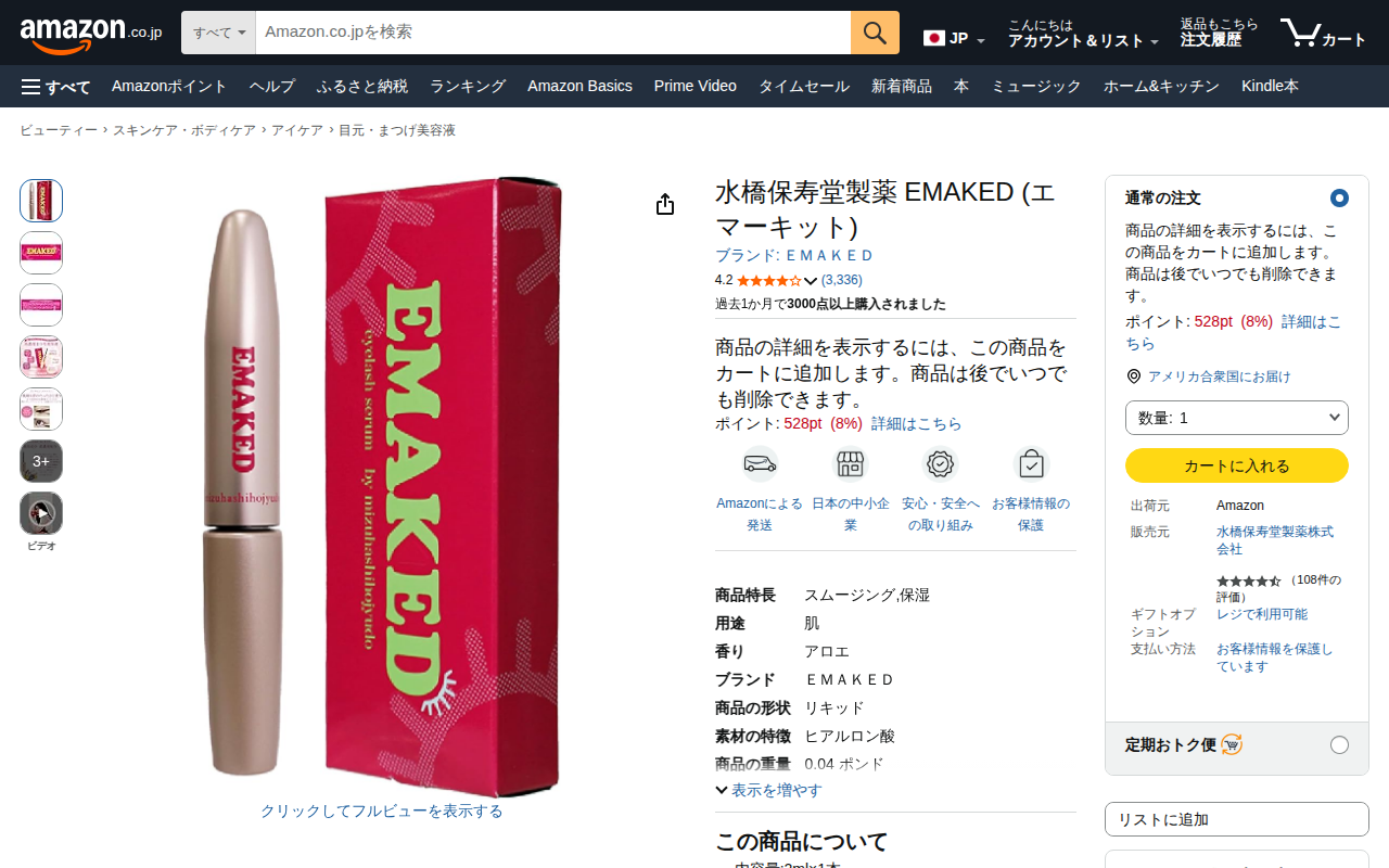 This page showcases EMAKED, an eyelash serum by Mizuhashi Houjudo Pharmaceutical. The product contains 2ml and...