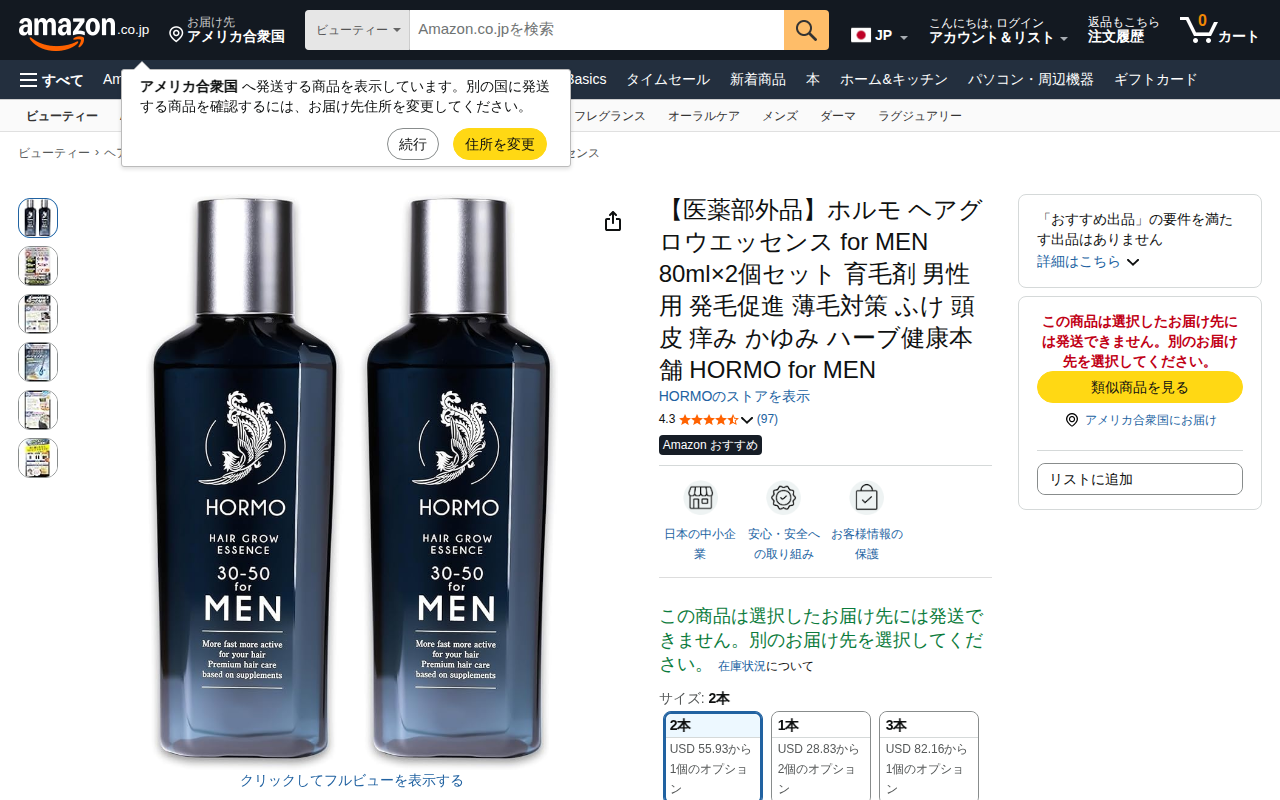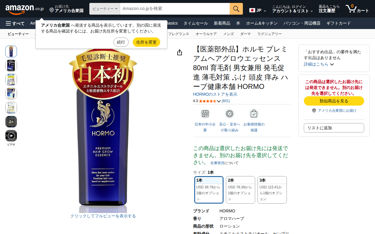 This page presents the HORMO Hair Growth Essence 80ml, a quasi-drug hair tonic product. It promotes hair growt...