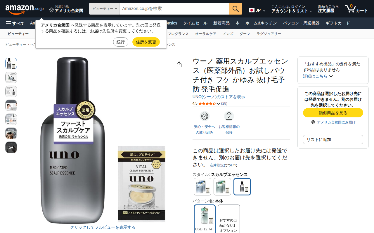 This page showcases UNO's medicated scalp essence on Amazon.co.jp, designed to prevent dandruff, itching, and ...