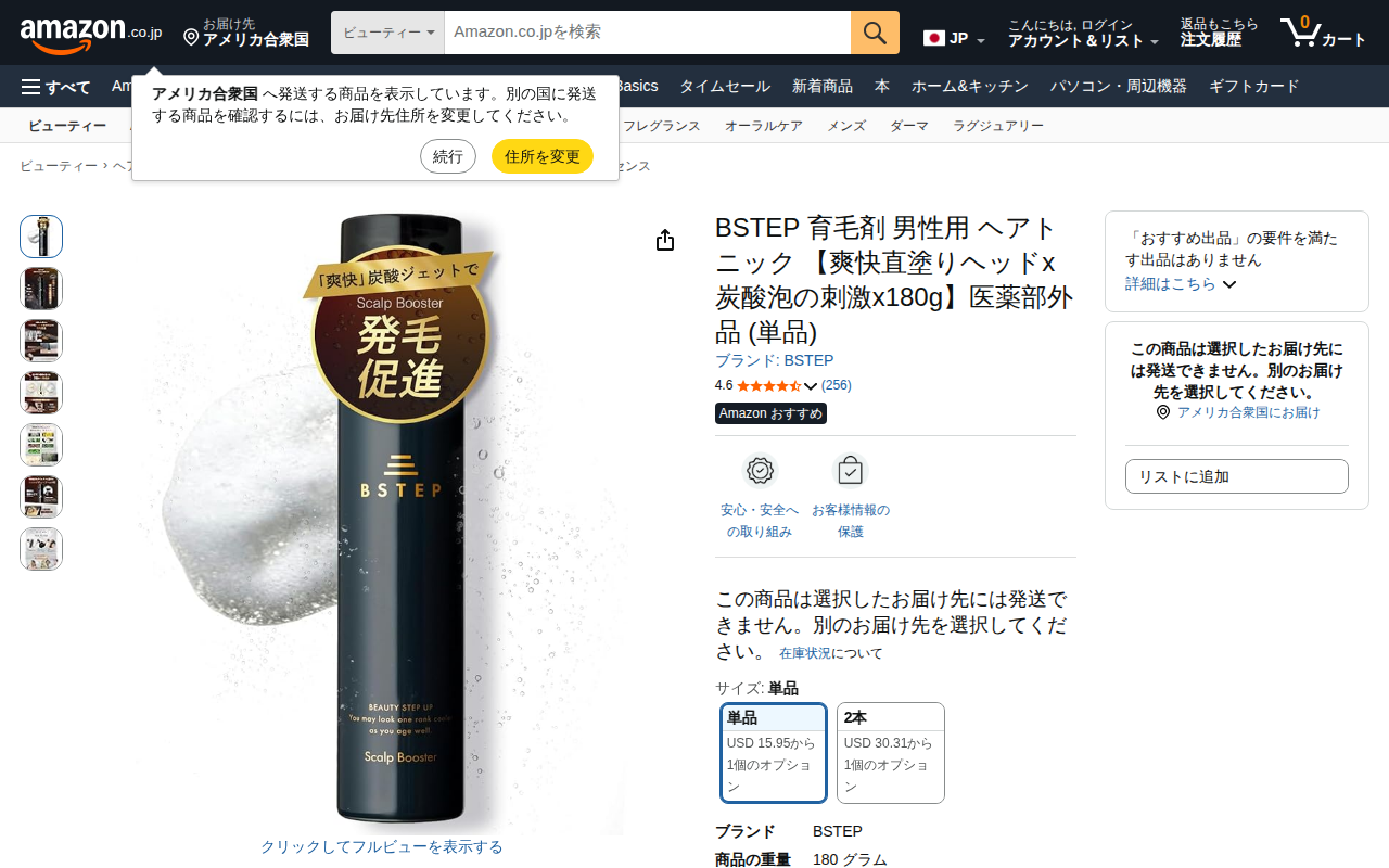 This page presents the BSTEP hair tonic for men on Amazon, a 180g quasi-drug product. It features carbonated b...