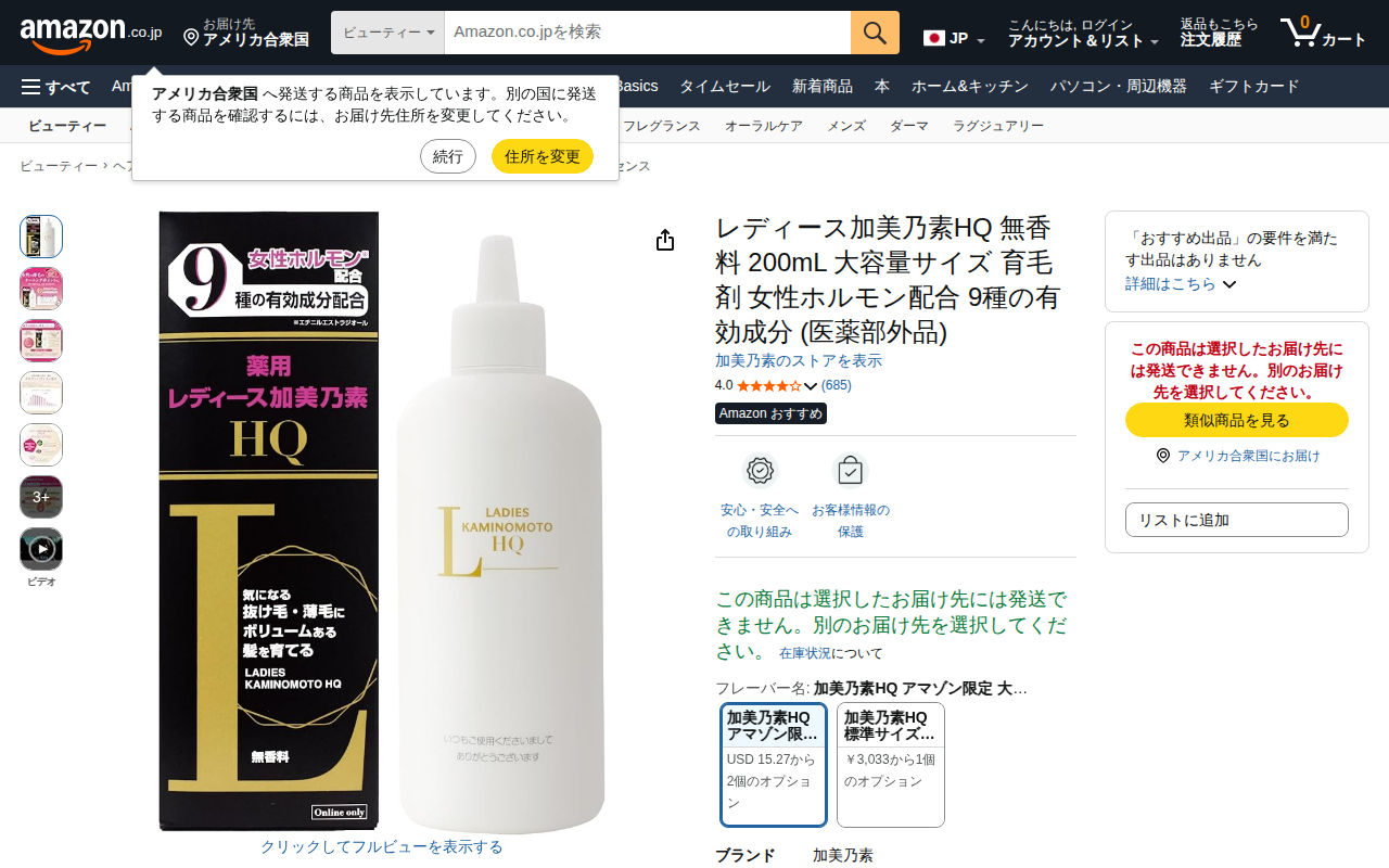 加美乃素HQ レディース無香料 200mL 大容量 育毛剤