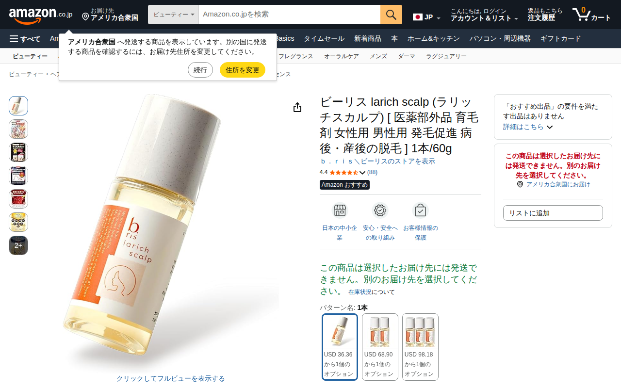 This page features the b.ris larich scalp hair growth tonic, a 60g quasi-drug product specialized for female h...