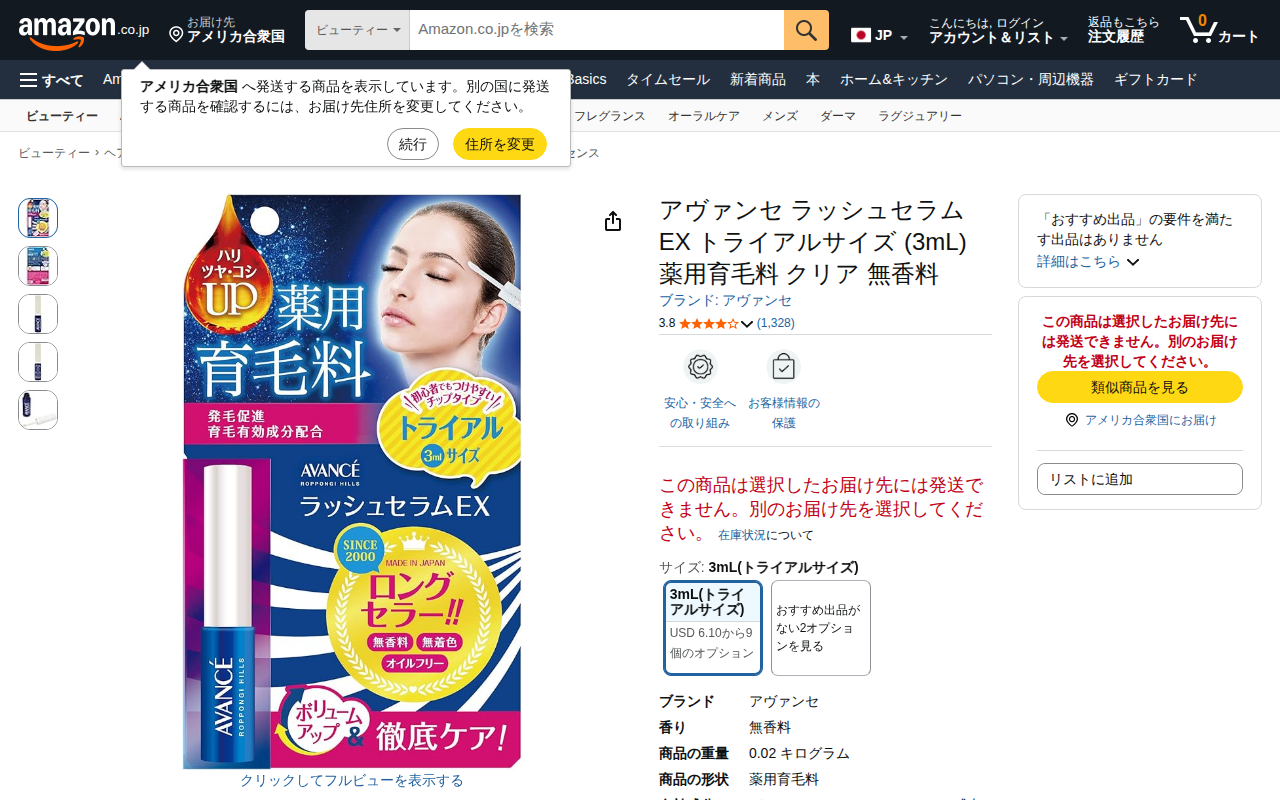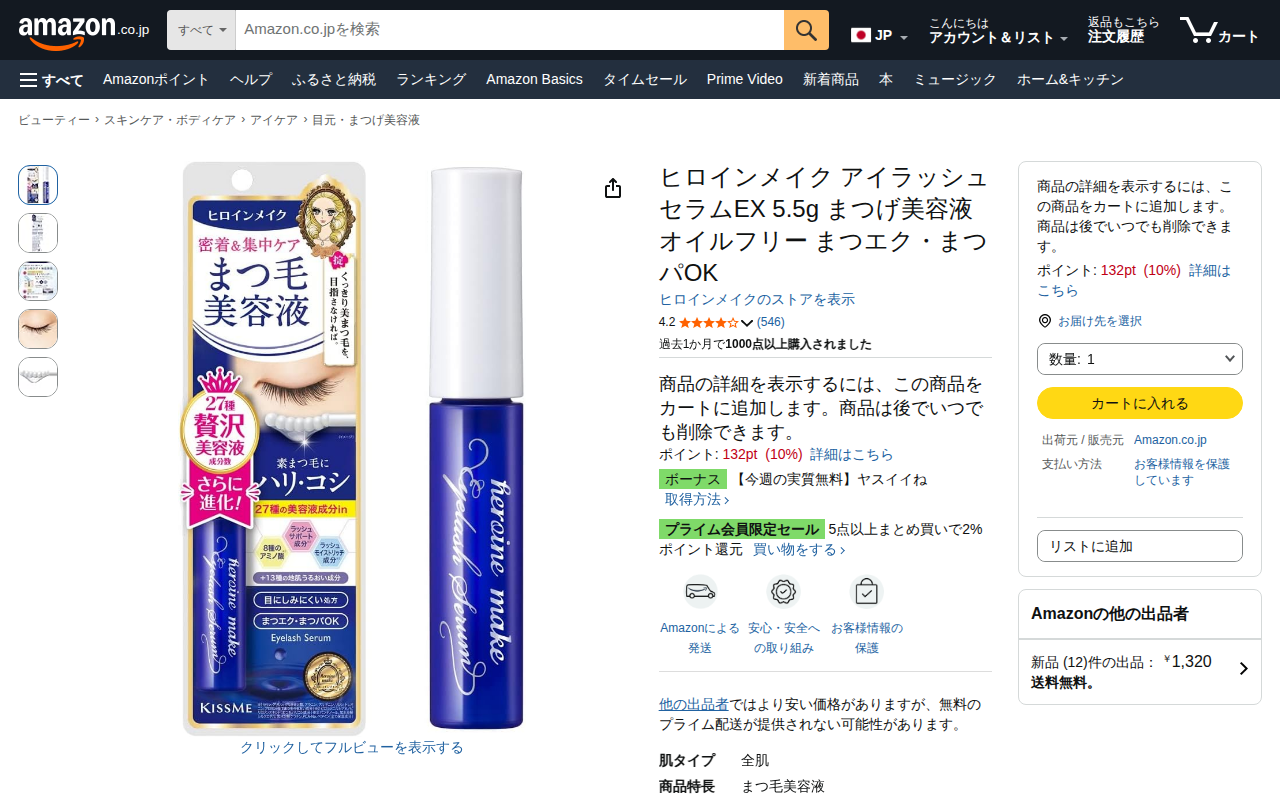 This page displays the Amazon.co.jp product listing for "Heroine Make Eye Lash Serum EX," a mascara serum cont...