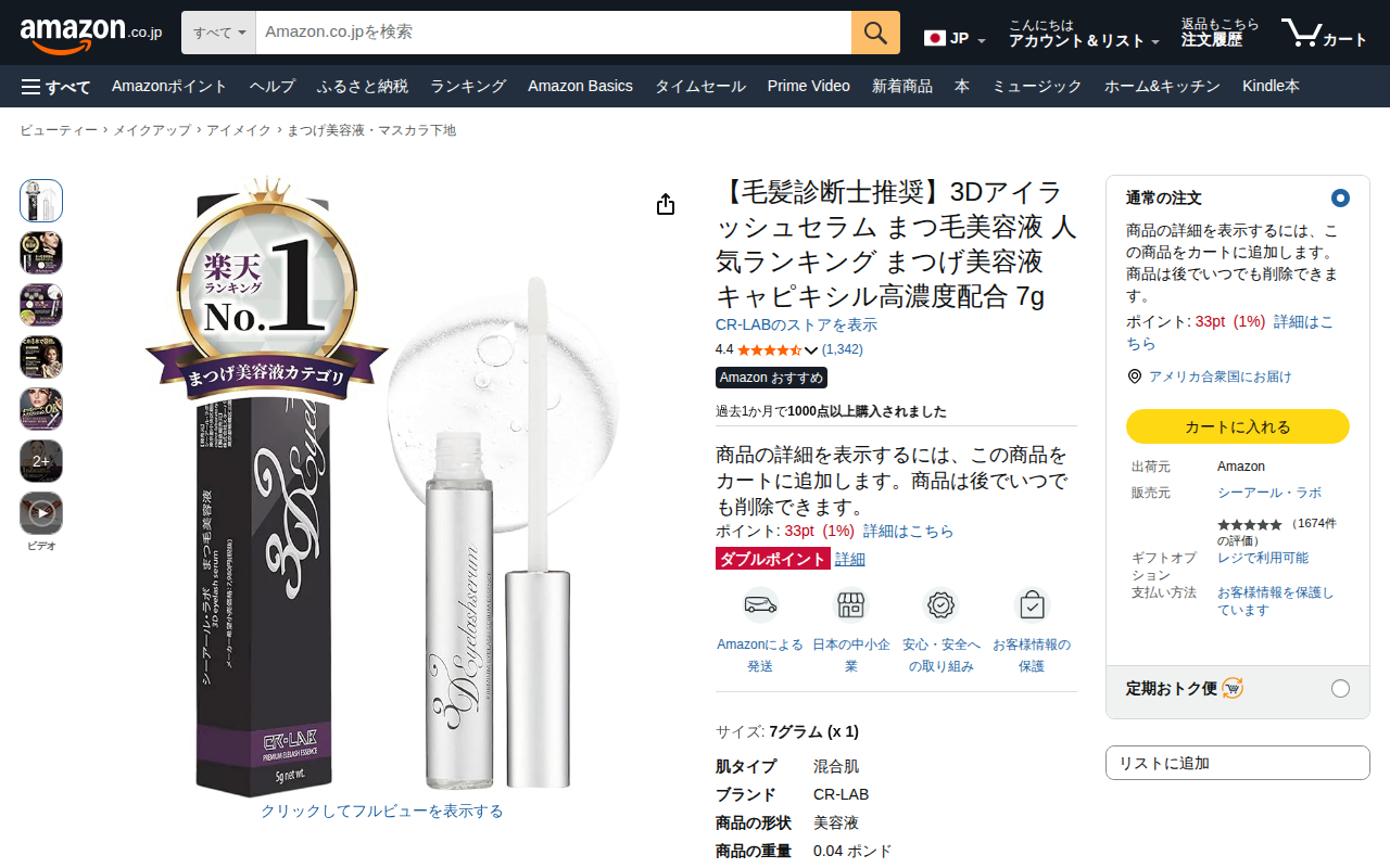 This page presents the CR-LAB "3D Eyelash Serum," an eyelash growth essence serum available on Amazon. It rank...